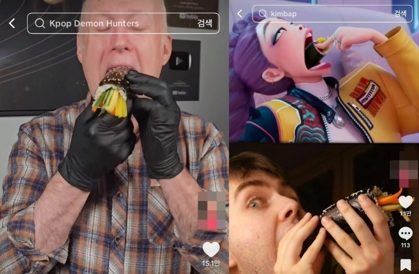 | 지난해 폭발적인 인기를 끈 애니메이션 케이팝데몬헌터스(우측 상단)에서 김밥을 먹는 장면이 나오며 SNS에 ‘김밥 먹기 챌린지’가 유행으로 번진 바 있다. |
