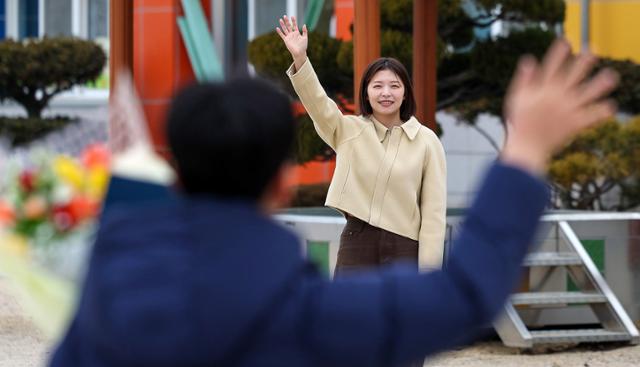 경북 영천시 금호읍 거여초등학교에서 올해 유일한 졸업생인 정세율(앞) 군이 10일 졸업식을 마친 뒤 담임 김희진 교사에게 씩씩하게 손을 흔들며 작별 인사를 하고 있다.