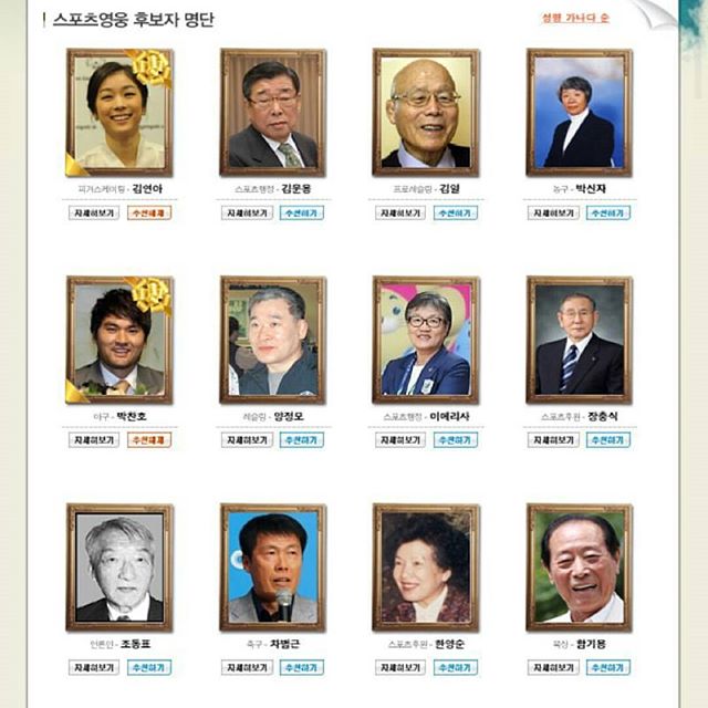 3. 이 후보들은 스포츠 영웅 선정 위원회를 거치면서 12명으로 압축되고 이 12명이 인터넷 국민 투표의 후보자가 되었다. 김연아, 박찬호, 차범근, 김 일, 양정모 등 스포츠 선수와 스포츠행정, 스포츠 후원인이 포함되었다.