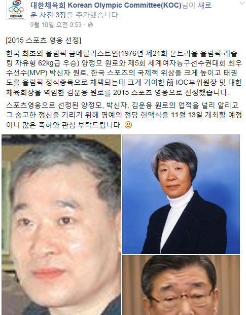 7. 9월 8일 개최된 제9차 스포츠영웅 선정위원회에서 위원들은 2015년 스포츠영웅에 몬트리올 올림픽 금메달리스트 양정모(62), 한국 농구가 배출한 유일한 세계선수권대회 최우수선수 박신자(74), 전 국제올림픽위원회(IOC) 부위원장 김운용(84)등 3명을 만장일치로 선정합니다