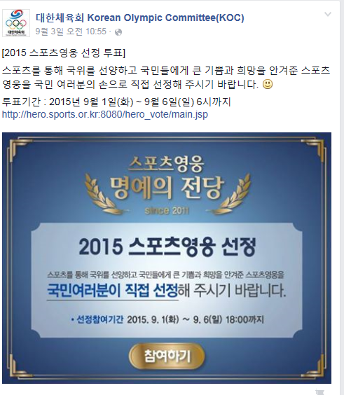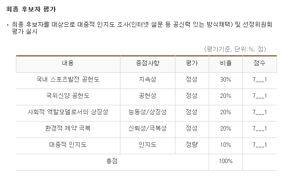 5. 대한체육회에서는 스포츠 영웅 선정을 위해 인터넷을 통한 국민투표와 함께 후보자들에 대한 업적평가도 진행하고 있는데 인터넷 투표는 이 업적평가에 10%만 반영된다. 인터넷 국민투표는 요식 행위였다는 것을 알 수 있다.