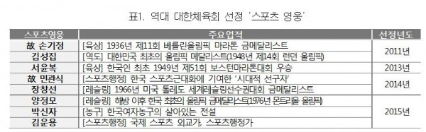 1. 대한체육회는 지난 2011년부터 스포츠 분야에서 탁월한 업적으로 보이고 한국 스포츠 발전에 기여한 사람들을 ‘스포츠 영웅’으로 선정해 발표하고 있다.