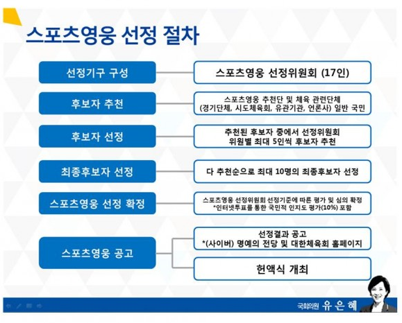 2. 올해는 스포츠 영웅 후보자 선정을 위해 우선 체육회, 체육학계, 체육 유관단체 등이 주축이 된 ‘추천단’과 경기 단체, 언론사 등으로부터 후보 추천을 받아 45명을 선정했다. 작년까지 있던 50세 이상이라는 연령 규정이 올해부터 사라졌다.