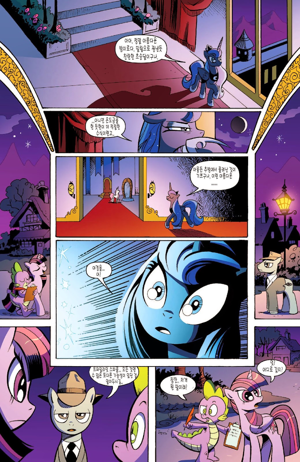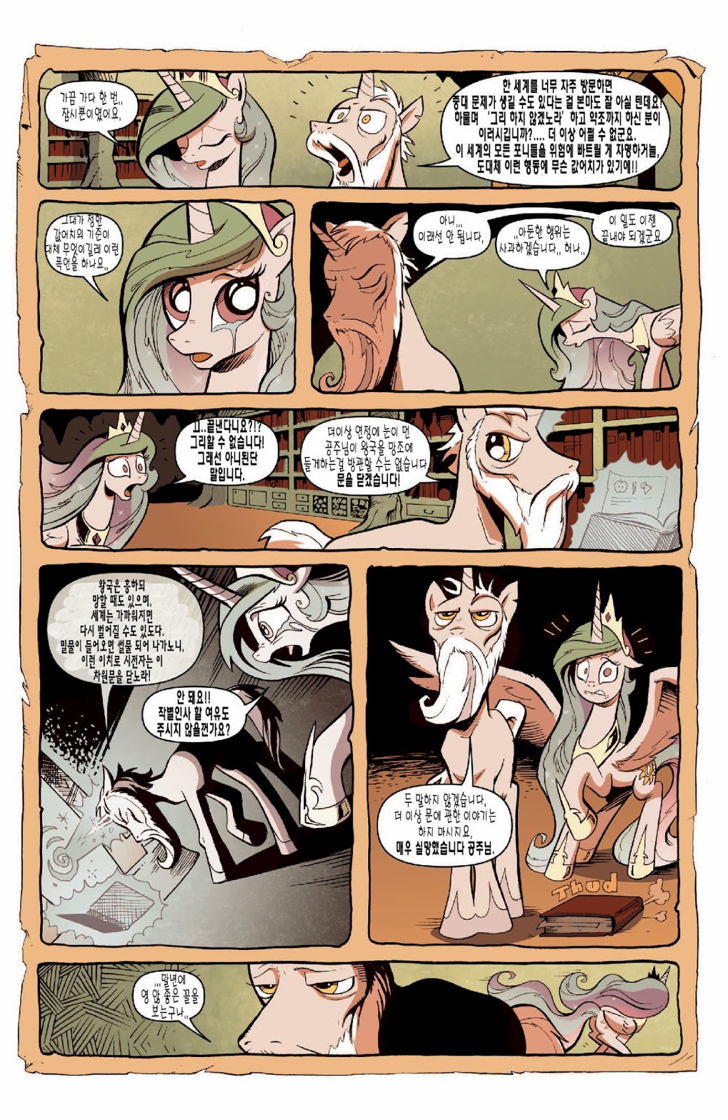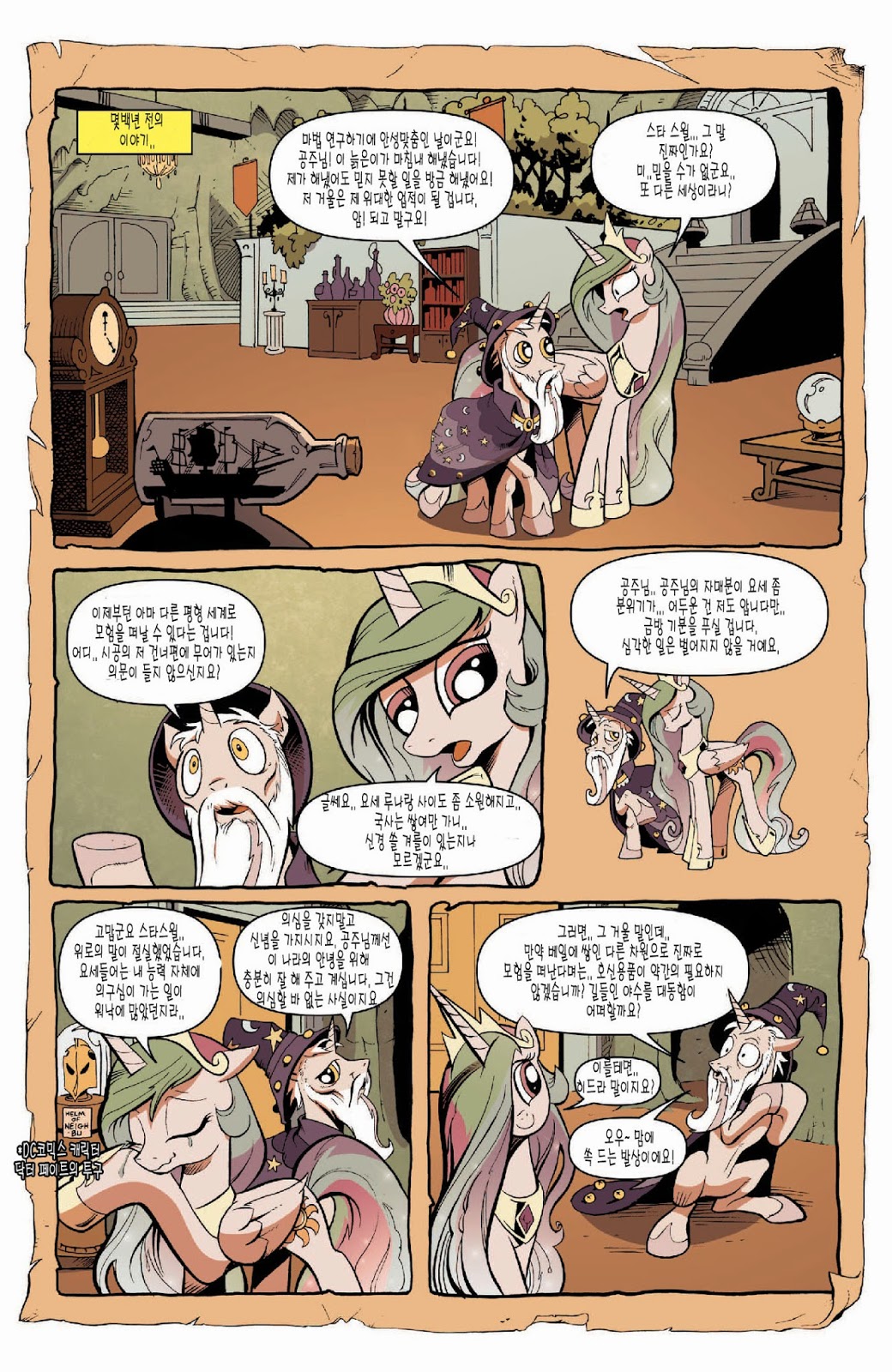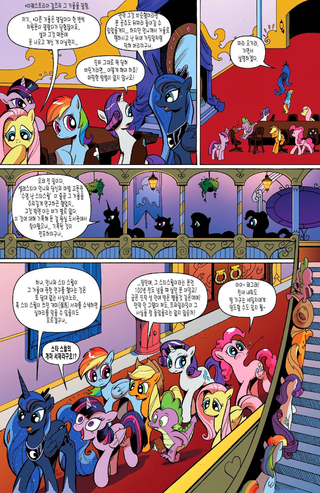 답지 않은 심각한 전개가 일품인 도입부였습니다. 트와일라잇의 자아성찰과, 지금껏 배경 소재로만 나오고 별 설정이 없었던 수염 난 스타스윌의 인상깊은 등장이 볼거리였죠. 아직은 미숙한 군주인 셀레스티아를 루나보다 먼저 달로 갈 각오를 하고 크게 질책하는 소신있는 충신의 모습에 꽤 인상 깊었습니다.