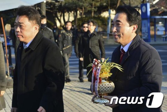 더불어민주당 박수현 비서실장(오른쪽)과 김성수 대변인이 2일 오후 박근혜 대통령의 64번째 생일 축하 난을 전달하기 위해 청와대로 향하고 있다.